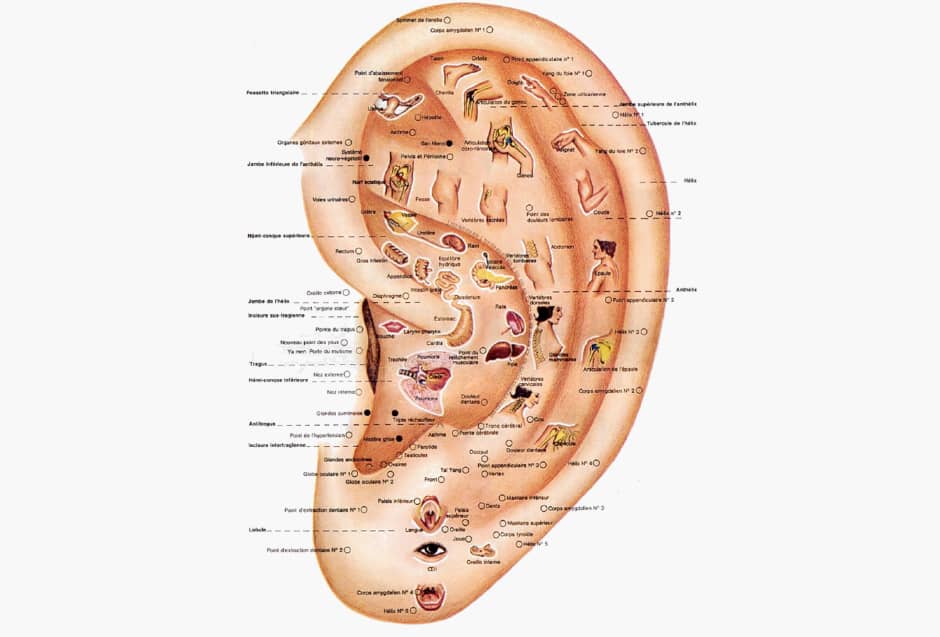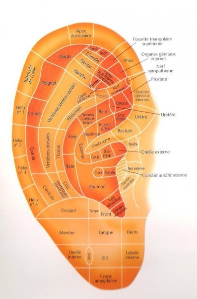 L’oreille est considérée comme une zone réflexe représentant une carte complète du corps, un peu comme un fœtus inversé (tête en bas, pieds en haut).